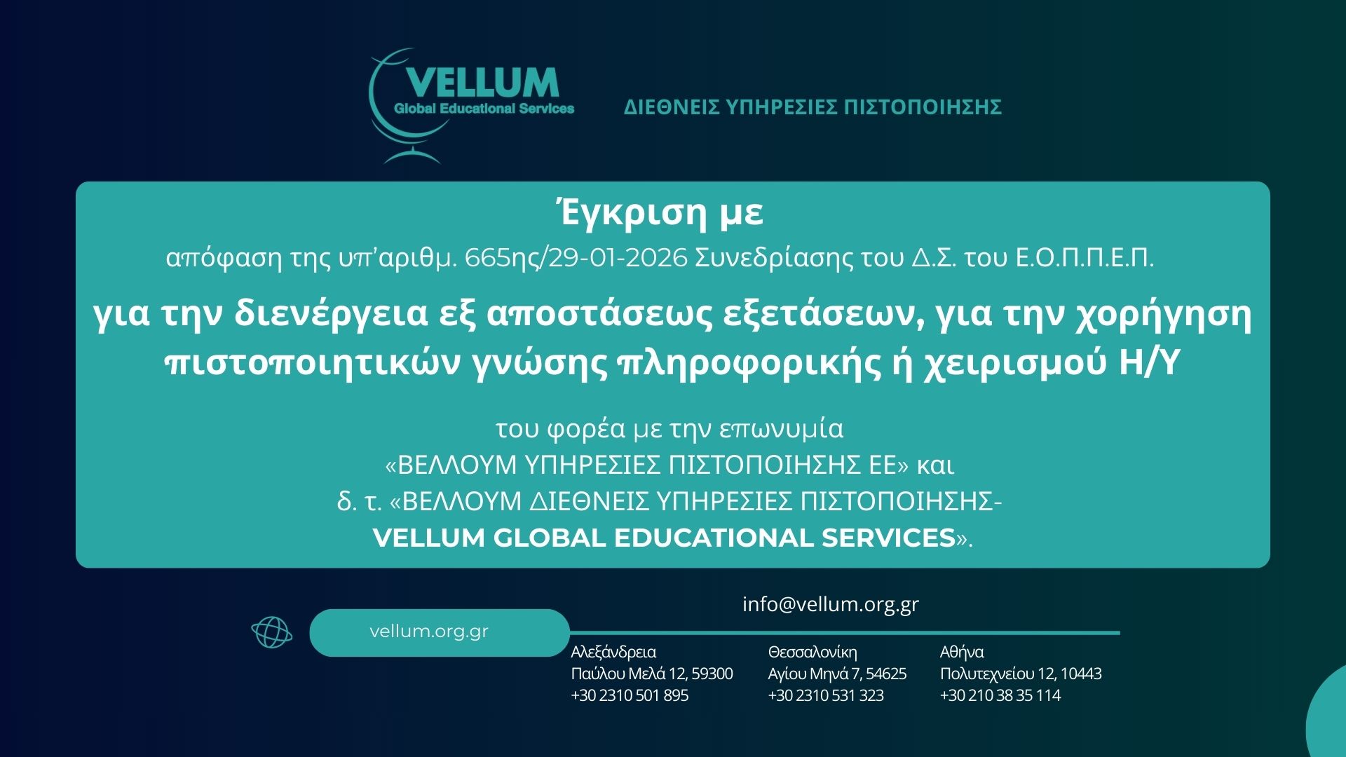 Η Vellum Global Educational Services είναι ένας από τους κορυφαίους παρόχους Πιστοποιήσεων δεξιοτήτων Πληροφοριών για την Τεχνολογία και την Επικοινωνία στην Ευρώπη.